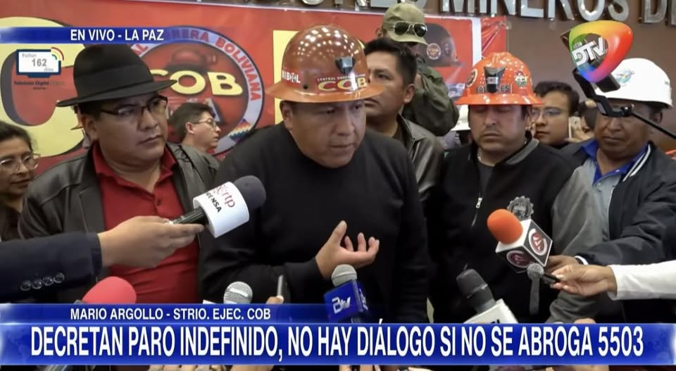El conflicto escaló rápidamente con la adhesión de uno de los sectores más combativos del sindicalismo boliviano: los mineros asalariados. Afiliados a la COB, declararon también huelga general indefinida y movilizada, pero fueron más allá del rechazo al decreto. Desde un ampliado nacional minero, el sector exigió la renuncia del presidente Rodrigo Paz y del conjunto del aparato gubernamental, ampliando el conflicto desde el plano económico al político.