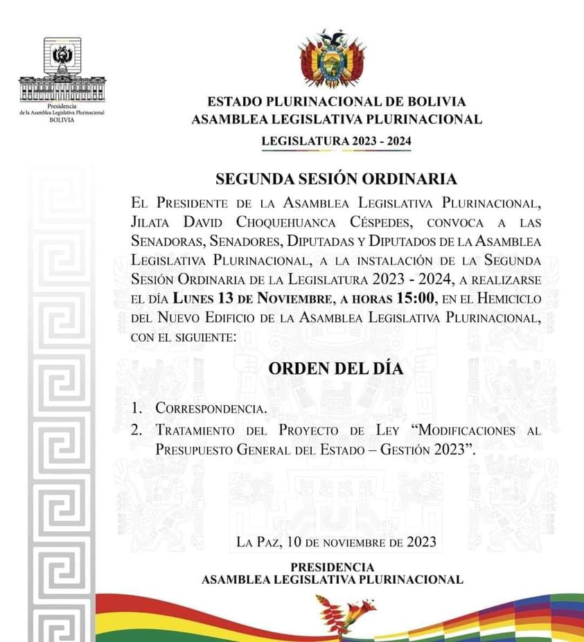 - LA PAZ, 13 nov (El Libre Observador) – La segunda sesión ordinaria de la Asamblea Legislativa Plurinacional se realizará este dia lunes 13 de noviembre a horas: 15:00, con el siguiente orden del día: