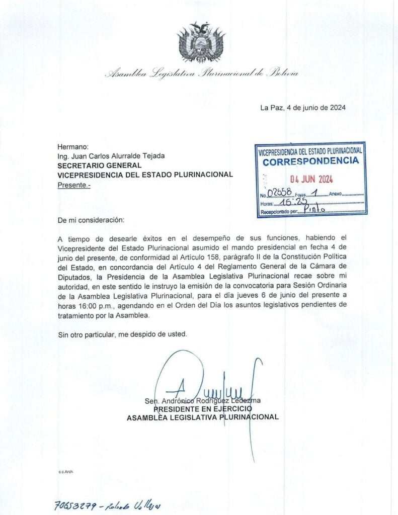 LA PAZ, 4 jun (El Libre Observador) — En una jugada política anticipada, el presidente del Senado, Andrónico Rodríguez, del ala «evista» del Movimiento Al Socialismo (MAS), se ha declarado presidente de la Asamblea Legislativa Plurinacional. En esa condición instruyó al secretario general de la Vicepresidencia, Juan Carlos Alurralde, a convocar una sesión plenaria urgente el jueves, en medio de una polémica sobre la titularidad del poder legislativo.